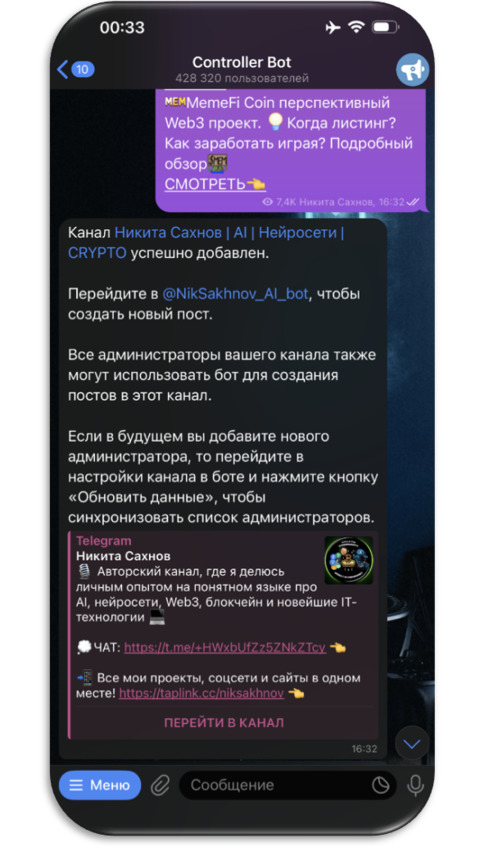 – Найдите подходящего бота: Один из популярных вариантов – @ControllerBot. Это многофункциональный бот для управления каналами.