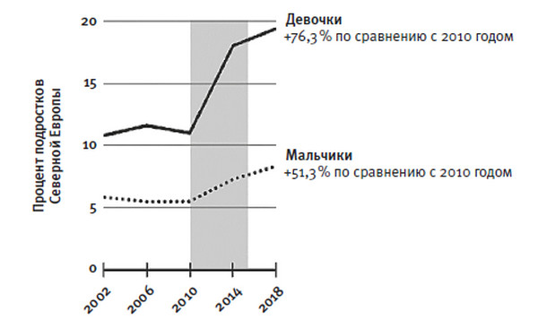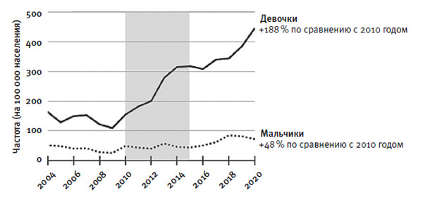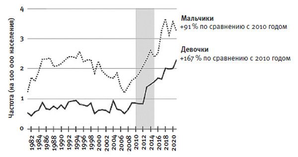 Как и в США и Канаде, в начале 2010-х годов с британскими детьми произошло нечто, из-за чего они значительно чаще стали причинять себе вред[88].