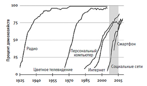 Смартфоны и создание поколения ZСмартфоны, появившиеся в 2007-м, изменили жизнь каждого. Как и радио с телевидением, они быстро захватили страну и весь мир. На рисунке 1.6 показан процент американских домохозяйств, которые приобретали устройства связи за последние сто лет. Как можно заметить, новые технологии распространялись стремительно и обязательно включали раннюю фазу практически вертикального роста: примерно десятилетие, в течение которого новые устройства покупали едва ли не все.