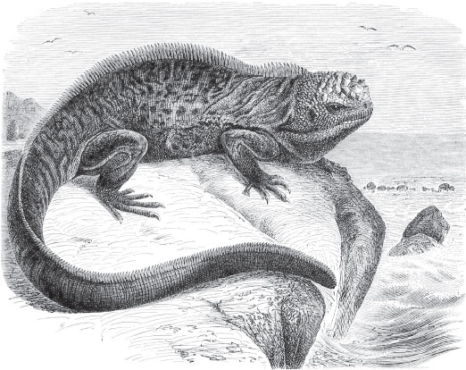 Морская игуана. Эндемик Галапагосских островов, впервые описанный Чарлзом Дарвином во время путешествия на «Бигле». Гравюра Питера Мёрера, 1892