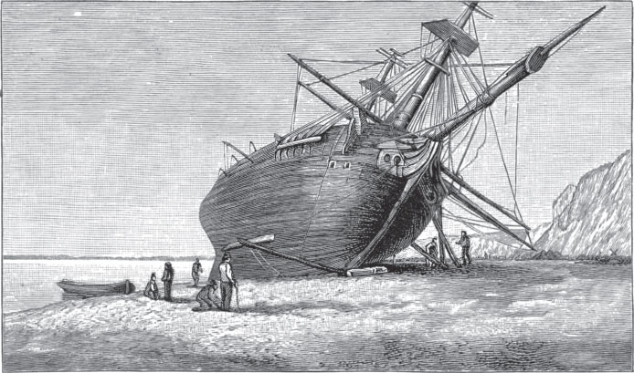 «Бигль» лежит на побережье в устье реки Санта-Круз. Гравюра Томаса Ландсира, 1838 (по рисунку Конрада Мартенса, 1834)