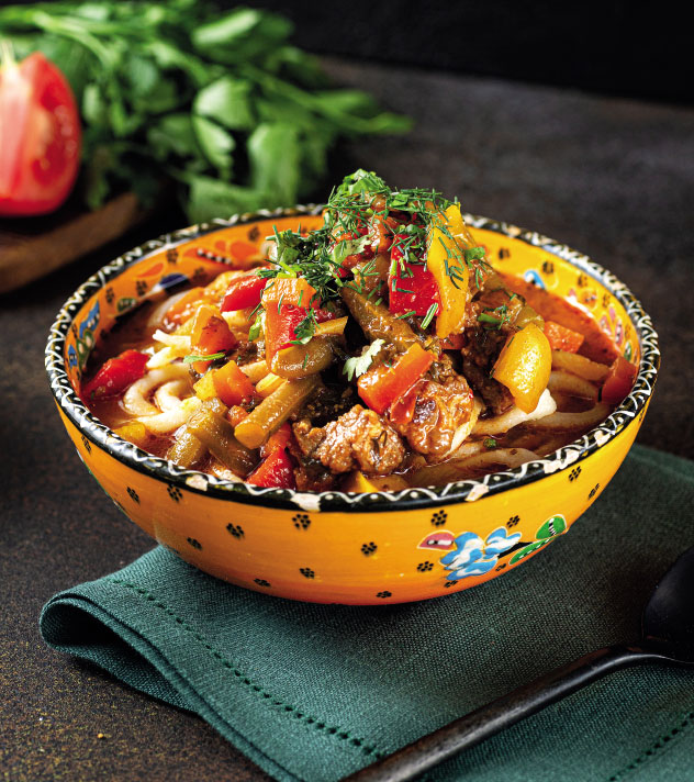 Суп, который может выступать и в роли полноценного второго блюда: наваристый бульон, тянущаяся лапша и мясо с овощами в густой заливке. В афганском казане лагман готовится быстро, а вкус получается по-настоящему аутентичным. Особенно лагман хорош с зеленью и кусочком лепешки.
