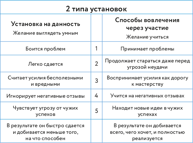 Знаменитое исследование американского психолога Кэрол Дуэк о фиксированном мышлении (установка на данность или на талант) и мышлении роста (установка на рост) доказывает, что похвала вроде «Ты гений!» или «Как легко тебе дается физика!» крайне опасна. Она формирует у ребенка убежденность в том, что он талантлив – а значит, не надо прикладывать усилия, стараться, усердно работать. Зачем, если и так «все легко дается»? При этом дети (да и взрослые тоже) с установкой на рост (см. рисунок) учатся на своих ошибках и не боятся нового[6].