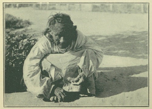 Procuring the church keys was not so simple a matter, as the building is now closed and services are held at very rare intervals. This is the result of litigation. The law has invaded this sheltered haven. Years ago, when times were different and the mission was making some pretense to be a living church, in the course of their duties a party of government surveyors came here. As a result of their surveys one of them told Mr. Viele in confidence that the entire mission holdings, olive orchards and lands were all on government property. Mr. Viele at once took steps to claim all, and did so. The secret leaked out, and others came in and attempted to settle on parts of the property under various claims of title, and soon the Catholic church and the claimants were engaged in a long lawsuit, which proved the death struggle of the church's interests. Mr. Viele emerged victorious, sole owner of the church, the orchard, the bells, and even the graveyard. Afterward, by deed of gift, he gave the church authorities the tumble-down ruin of the church, the dark adobe robing room, the bells and the graveyard, but, because Mr. Viele still withheld the valuable lands from the church, no services are held there, and the quarrel has gone on year by year. Mr. Viele clings to what he terms his legal rights, and the church is locked up and the Indian left largely to his own devices. Once in possession of the keys, we found them immense pieces of iron, and it took some time to unlock the door. The services of one of the Indian pupils materially assisted us in our investigations. The church is a veritable curiosity, narrow, long, low and dark, with adobe walls and heavy beams roughly set in the sides to furnish support for the roof. Canes and tules constitute this part of the structure. The earthen walls are covered with rude paintings of Indian design and of strange coloring that have preserved their tone very well indeed. Great square bricks badly worn pave the floor, and, set in deep niches along the walls at intervals, are various utensils of battered copper and brass that would arouse the cupidity of a collector of bric-a-brac. The door is strongly barred and has iron plates set with large rivets. The strange light that comes through the narrow windows and broken roof sheds an unnatural glow on the paintings upon the walls and puts into strange relief the ruined altar far distant in the church. Three wooden images yet remain upon the altar, but they are sadly broken and their vestments are gone. One is a statue of St. Louis, and is held in great veneration by the Indians. They say it was secretly brought from the San Luis Rey Mission and placed here for safe keeping. When the annual reunion of the Indians takes place this image is decorated in cheap trappings and occupies the post of honor in the procession. The robing room is a small, dark apartment behind the altar, where not a ray of light could enter. We dragged a trunkful of altar trappings and saints' vestments out into the light. The dust lay thickly upon the garments in these old chests, and it is to be hoped that no one with a shade less of morality than we had will ever explore their treasures, or the church may be robbed and the images suffer much loss of their decorative attire. Undoubtedly everything of value has long since been removed, but what remains is very quaint and odd, being largely of Indian workmanship. Everything about this simple structure spoke of slow and patient work by the native workmen, and it needed but little imaginative power to conjure up the scene when men were hauling trees from the mountains, making the shallow, square bricks, preparing the adobe, and later painting these walls as earnestly perhaps as did some of the greater artists in the gorgeous chapels of cultivated Rome. The hinges creaked loudly and the great key grated harshly in the rusty lock as we spent some time in securing the fastenings at our departure. The beauty of the valley and the bright sunlight were in great contrast to the cool shadows of the dimly-lighted church. Once outside, we again made the circuit of the outlying walls, where birds sing and grasses grow from the ruined walls of the adobes. Through gaps in them we passed from one enclosure to another, this one roofless, that one nearly so, and a third so patched up as to hold a few Indians who make it their home, and in tiny gardens cultivate a few flowers or vegetables and prepare their food in basins sunken in the firm earth. A few baskets are yet left in this community, but of poor quality, the more valuable ones having been long since gathered by collectors, or sold and gambled by the Indians themselves. Many curious relics still exist, however, for those who are willing to pay several times the value of each article.